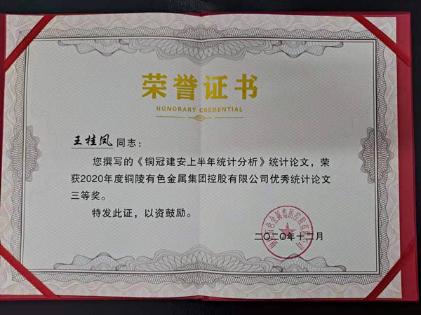 12月29日,在集團(tuán)公司統(tǒng)計(jì)工作會(huì)議上,公司獲“2020年度統(tǒng)計(jì)工作先進(jìn)單位”榮譽(yù)稱(chēng)號(hào),公司《銅冠建安上半年統(tǒng)計(jì)分析》論文榮獲集團(tuán)公司優(yōu)秀統(tǒng)計(jì)論文三等獎(jiǎng)。